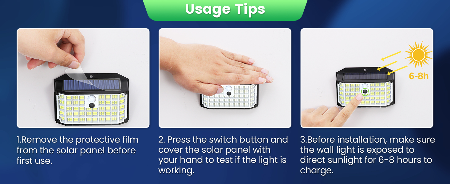 Install the lights in a sunny area. They charge during the day and automatically turn on at night when motion is detected.